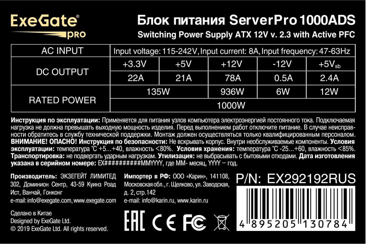 Серверный БП ExeGate 1000W ServerPRO-1000ADS ATX, APFC, КПД 82% 80 PLUS, 2x8cm fans, 24pin, 2x4+4pin, 2xPCI-E, 10xSATA, 5xIDE, black 292192