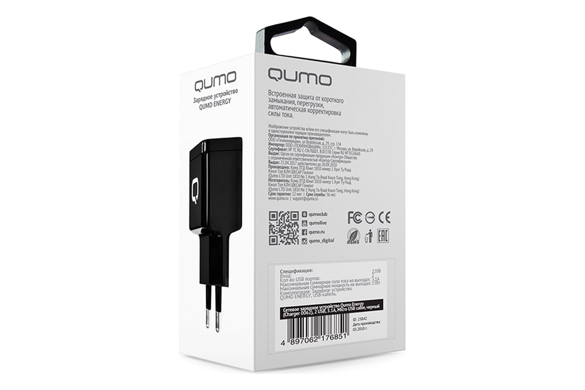 Сетевое зарядное устройство QUMO Energy Charger 0061, 2 USB, 3.1A, Micro USB cable, черный 23842