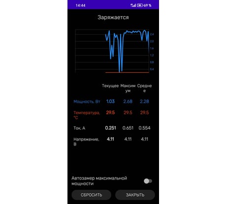 Реальная мощность зарядки 2,7Вт. Сила тока 0,6А