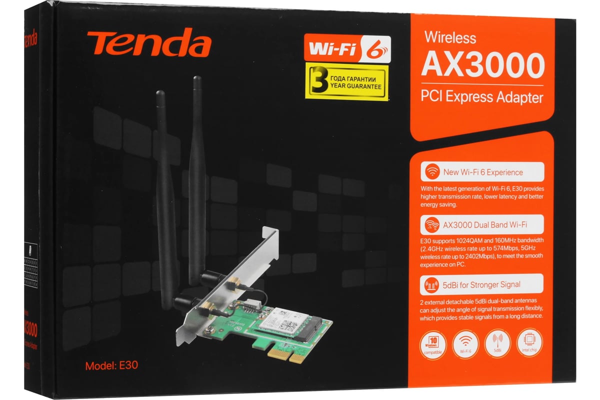 Сетевой PCIe адаптер Tenda E30 AX3000 Wi-Fi 6, 2,4/5 ГГц, до 2,98 Гбит/с, 2x5dBi внешние антенны 10000090499