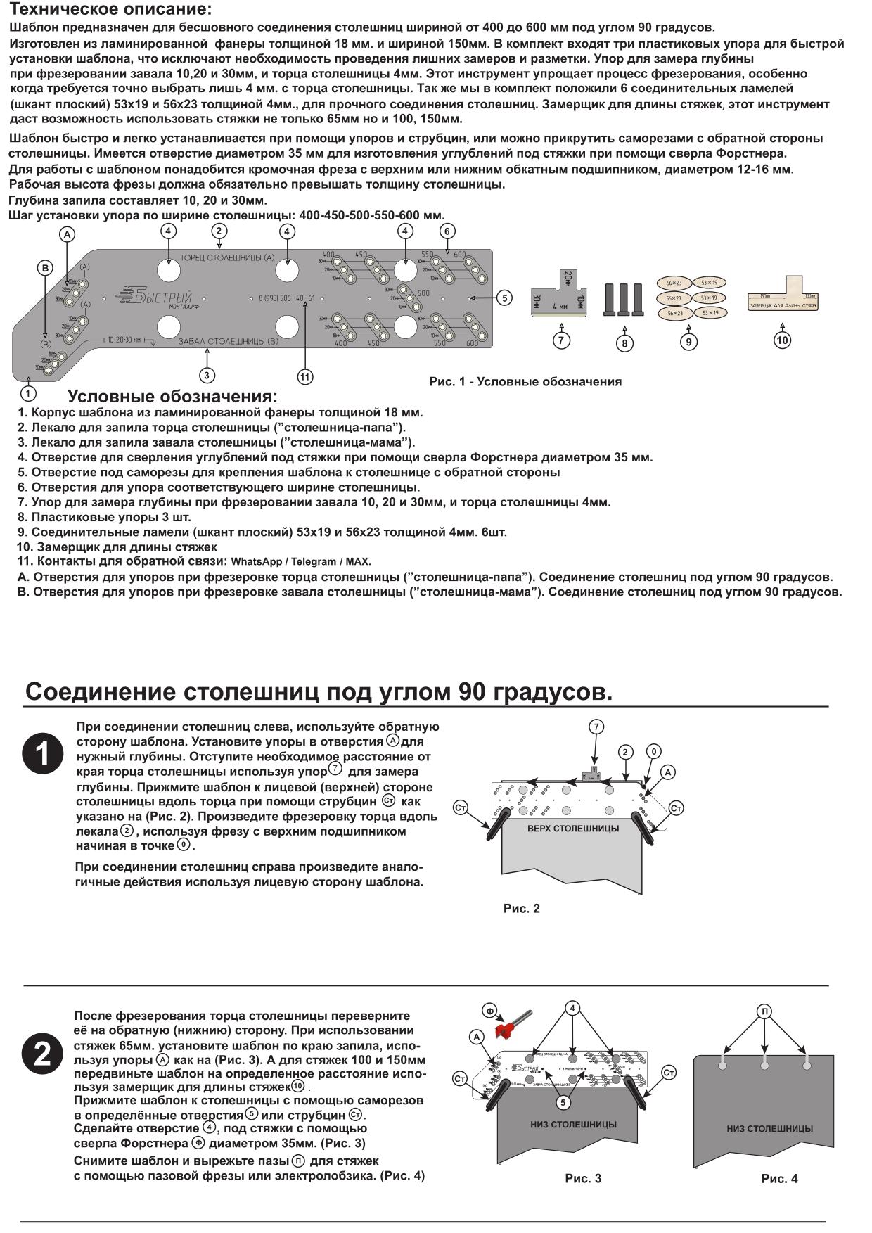 Изготовлен из ламинированной фанеры толщиной 18 мм. и шириной 150мм. Шаблон можно крепить к столешнице не только саморезами, но и струбцинами. Что позволяет делать запил одной фрезой с верхним подшипником проходя фрезером по шаблону, а не по столешнице. Глубину запила можно делать на 10, 20 и 30мм. Шаблон упаковывается в специальный чехол для удобства хранения и переноски. В комплект входят упор для замера глубины, три пластиковых упора для быстрой установки шаблона, которые значительно экономят время и исключают необходимость проведения замеров и разметки, так-же в комплект входят 6 соединительных ламелей (шкант плоский) 53х19 и 56х23 толщиной 4мм., для прочного и надёжного соединения столешниц. Мы еще добавили замерщик для длины стяжек, этот инструмент даст возможность использовать стяжки не только 65мм. но 100 и 150мм.