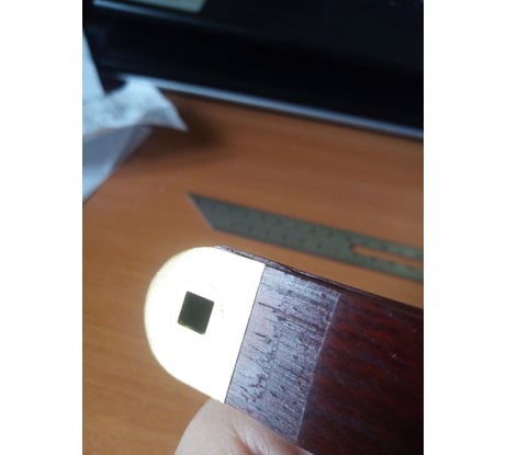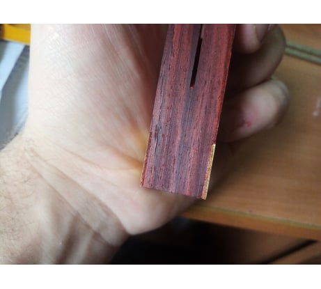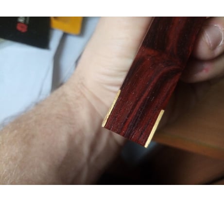 На линейке угловая кромка после рубки не заслесарена имеет заусенцы, рукоятка с острыми краями, можно было бы их притупить небольшим радиусом, латунные вставки не по размеру и приклеены до покрытия морилкой, торцы вставок закрашены вместе с рукоятью, но самое главное обжимные губки не соосны (см. фото)... надеюсь это не брак, а техническое решение для более сильного обжима потому что линейка стоит плотно, но это не красиво