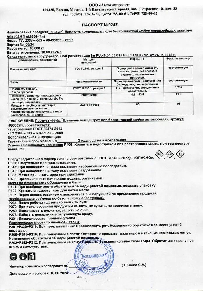 Технические характеристики шампуни для бесконтактной мойки автомобиля Hi-Gear HG8009