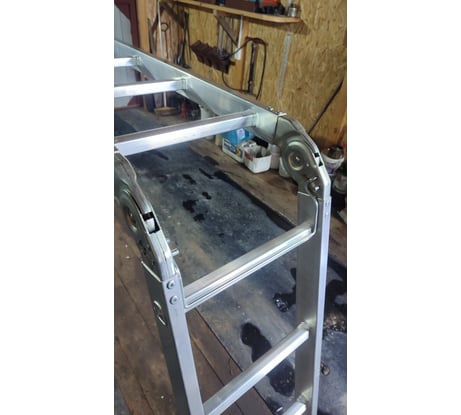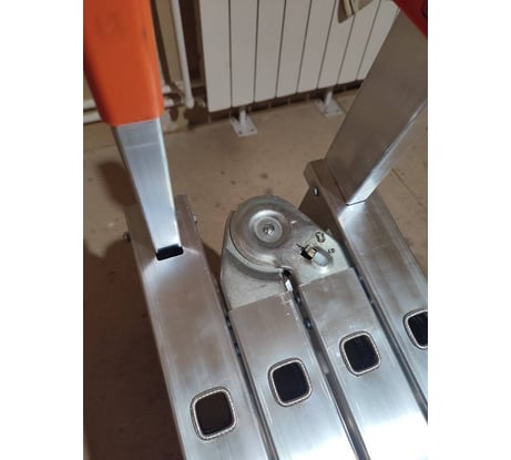 Удобно раскладывается благодаря таким фиксаторам, устоичивая. На болты которые фиксируют лапы одеты пластиковые трубки, что препятствует износу каркаса лестницы.