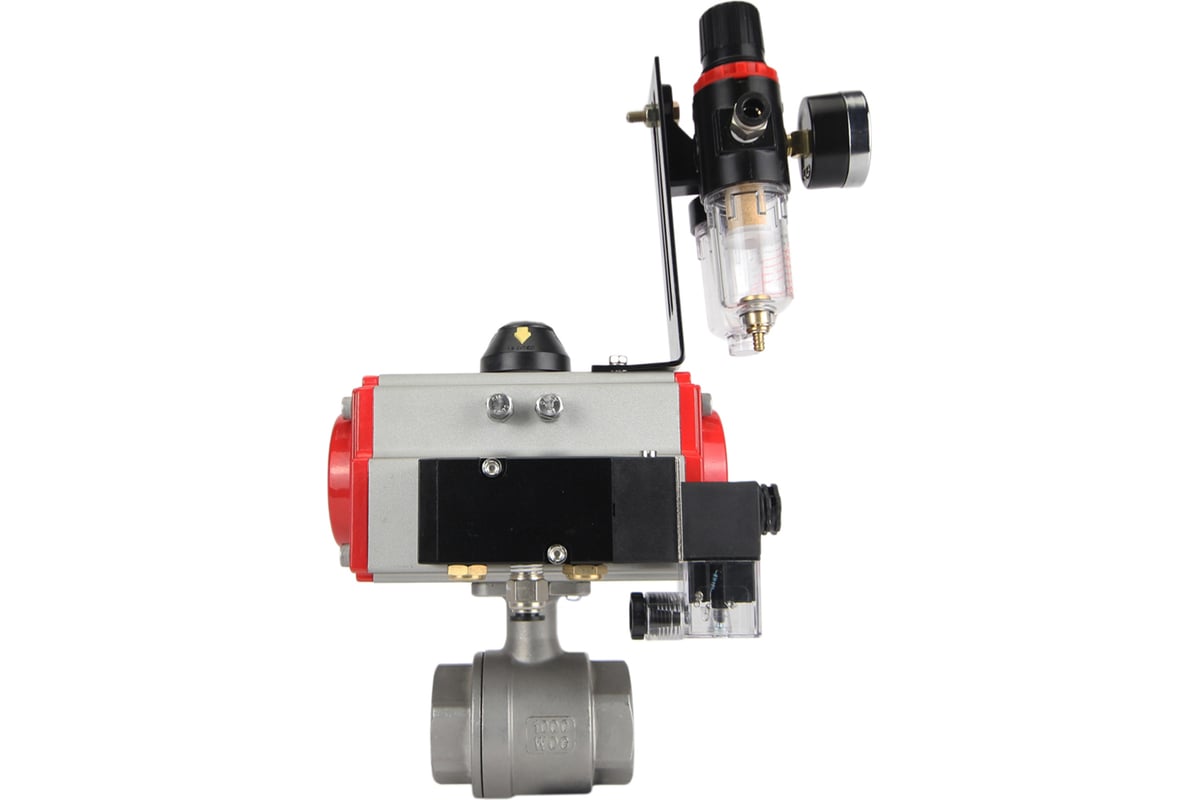Кран шаровой DN.ru КШМП.316.230-ISO с пневмоприводом DA-083, пневмораспределителем PND2-S1EM-52-1NC-J08-220VAC, блоком подготовки воздуха APU1-10-40-V08 применяется в качестве запорной арматуры в системах теплоснабжения, водоснабжения, в паровых, топливных и пневмосистемах со сжатым воздухом и нейтральными газами.