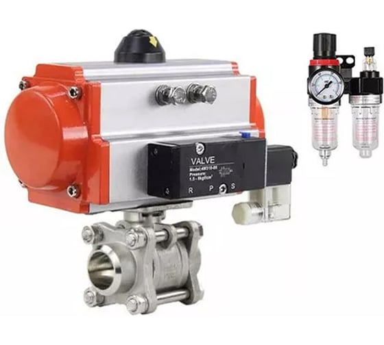 Кран шаровой DN.ru КШПП 316.200-ISO полнопроходной под приварку с пневмоприводом DA-083, пневмораспределителем PND1-S2EM-52-2-T08-220VAC, блоком подготовки воздуха APU1-10-40-V08 применяется в качестве запорной арматуры в системах теплоснабжения, водоснабжения, в паровых, топливных и пневмосистемах со сжатым воздухом и нейтральными газами.