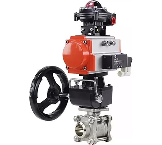 Кран шаровой DN.ru КШПП 316.200-ISO полнопроходной под приварку с пневмоприводом DA-052, пневмораспределителем PND2-S1EM-52-1NC-J08-220VAC, БКВ LSB-510-02ExM12-250, ручным дублером HDM-1.