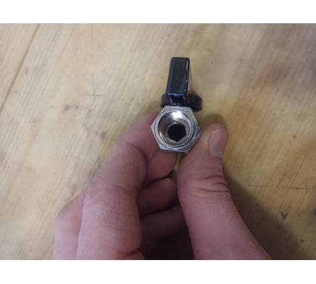 Воду на небольшом давлении держит. Обработано все хорошо. Нареканий по качеству резьбы нет. Шар перекрывает плотно. У винтика маленький шлиц, но не беда.