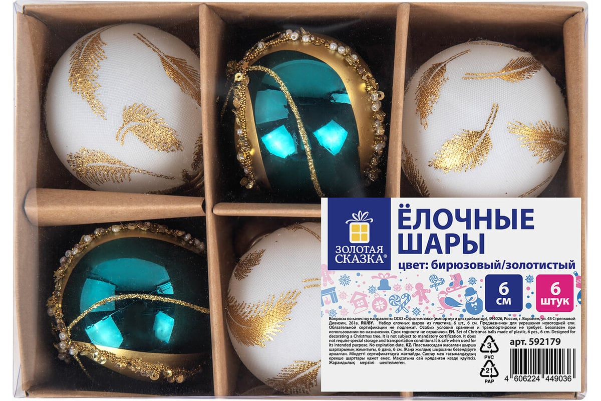 Шары елочные Золотая сказка "Peacock", 6 шт., 6 см, пластик, бирюзовый/золото 592179