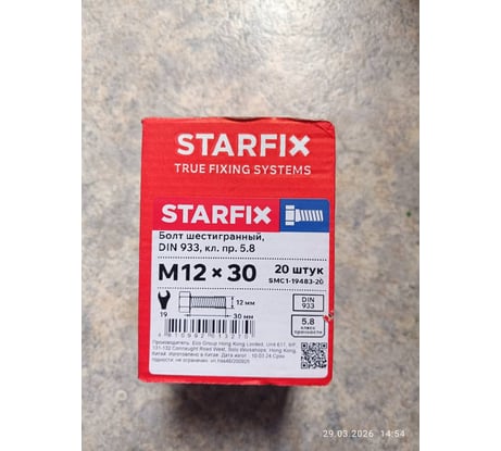 Шестигранный болт STARFIX М12x30 мм, цинк, класс прочности 5.8, DIN 933, 20 шт. SMC1-19483-20 представляет собой стержень с полной наружной метрической резьбой и шестигранной головкой под ключ. Изготовлен из конструкционной стали и оцинкован. Применяется для соединения и крепления деталей в машиностроении и приборостроении.