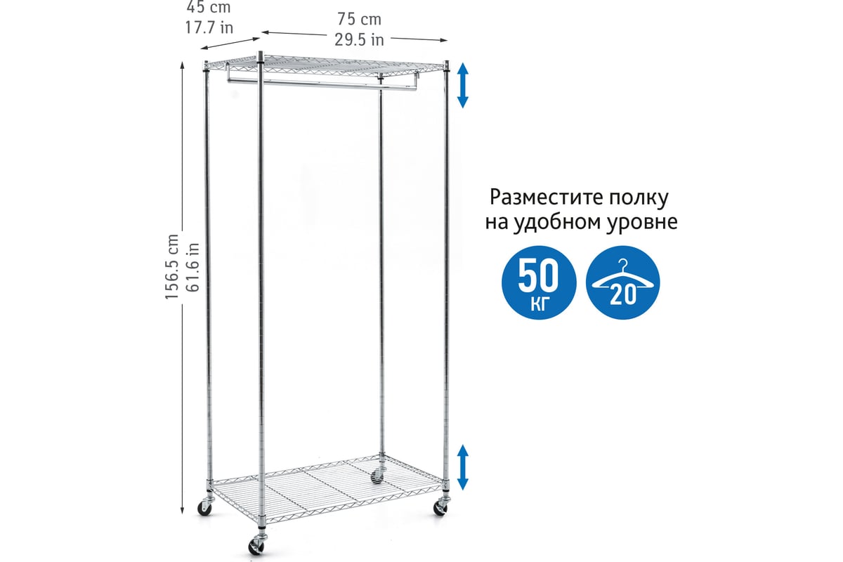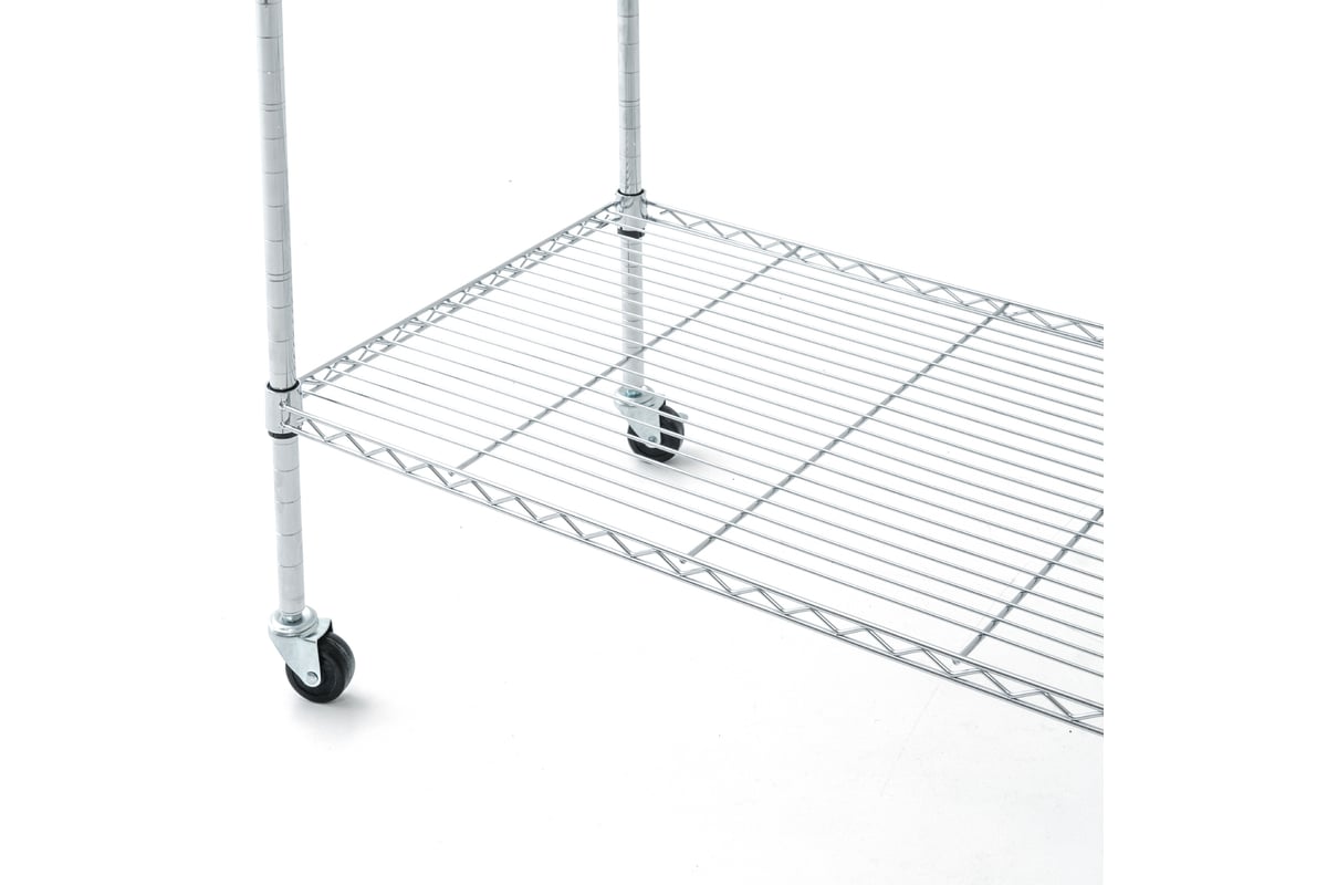 Прочный и долговечный металлический каркас, 2 полки, 1 подвесная рейка, 4 вращающихся колеса (2 со стопами). Материал: хромированная сталь.
