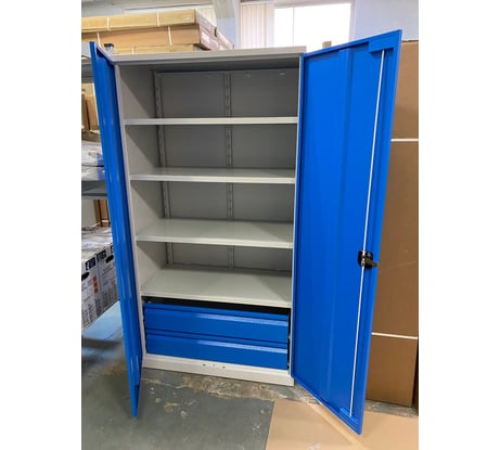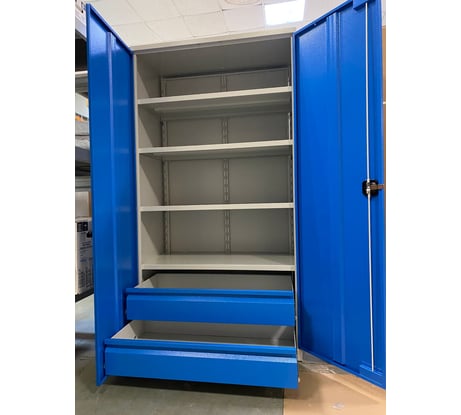 Вместительный: 2 ящика, 4 полки, разместил почти весь инструмент. Сборка на резьбовых заклепках и винтах - прочно. Отверстия совпали, "кувалдометр" не пригодился. Сборно-разборный: удобно в цокольный этаж по частям опустить и собрать в мастерской - поэтому и брал сборный, а не сварной. Сборка простая и не сложная. Неплохое ЛКП, если бы небыло повреждено еще до упаковки. Качественные бесшумные направляющие у ящиков - неожиданно! Дверцы бесшумно поворачиваются - приятно.