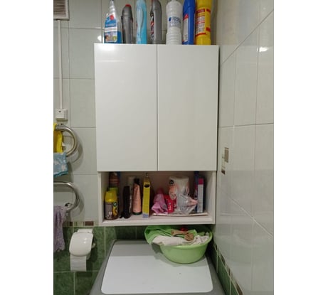 есть открытая полка для быстрого доступа часто используемых предметов, а внутрь можно убрать химию (при необходимости спрятать от маленьких детей - можно дополнительно приклеить детский замок). Не потребовалась сборка, снял упаковку и сразу можно повесить.