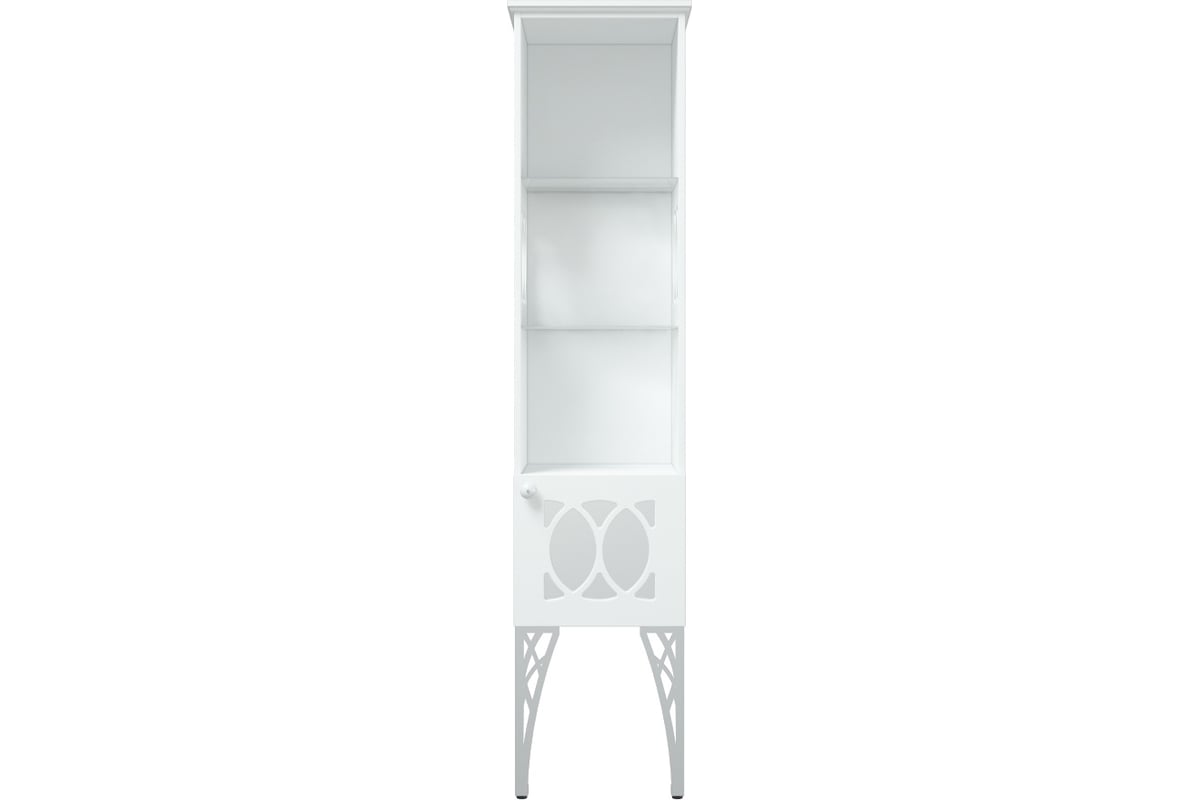 В боковинах имеется сквозная фрезеровка, как и на фасаде, две вкладные полки из стекла толщиной 8 мм. Верхняя крышка пенала имеет фрезеровку. Задняя стенка является зеркалом.