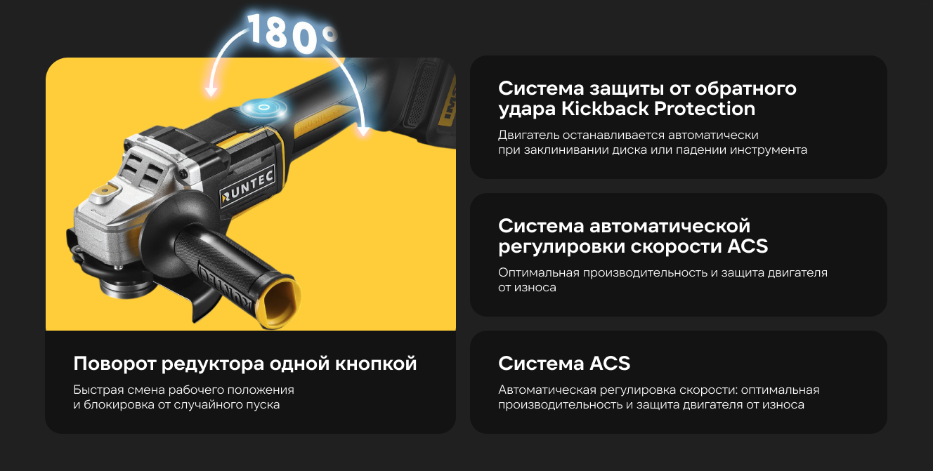 УШМ оснащена системойавтоматической регулировки скорости ACS, которая позволяет добиться оптимальной производительности и уберегает двигатель от преждевременного износа. Доступна регулировка оборотов, что позволяет адаптировать инструмент для различных видов работ. Система Kickback protection обеспечивает повышенную безопасность благодаря автоматической остановки диска в случае его заклинивания или падения инструмента.