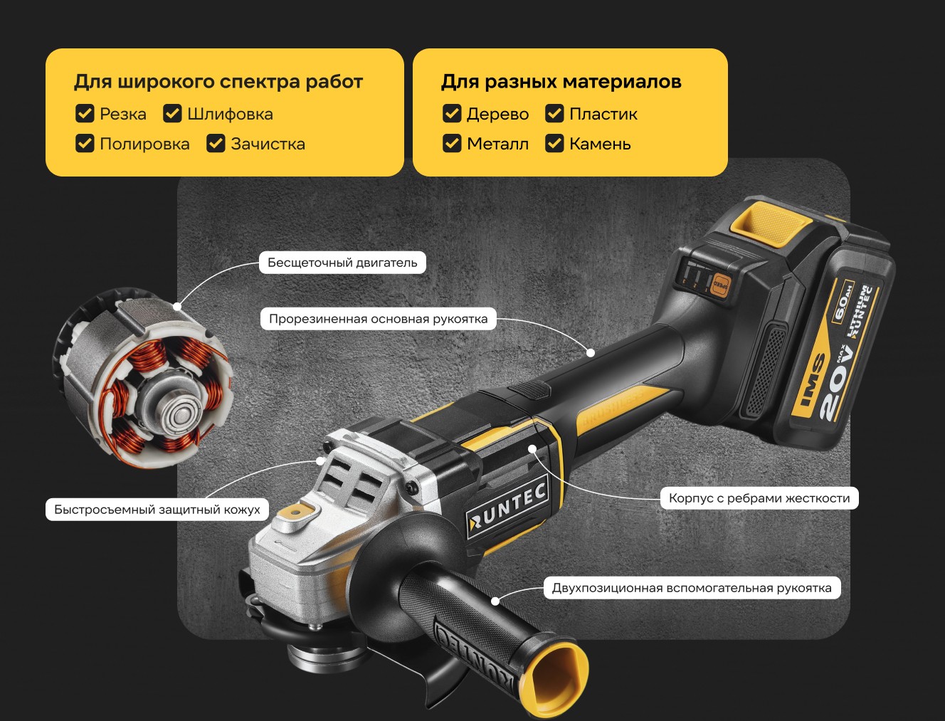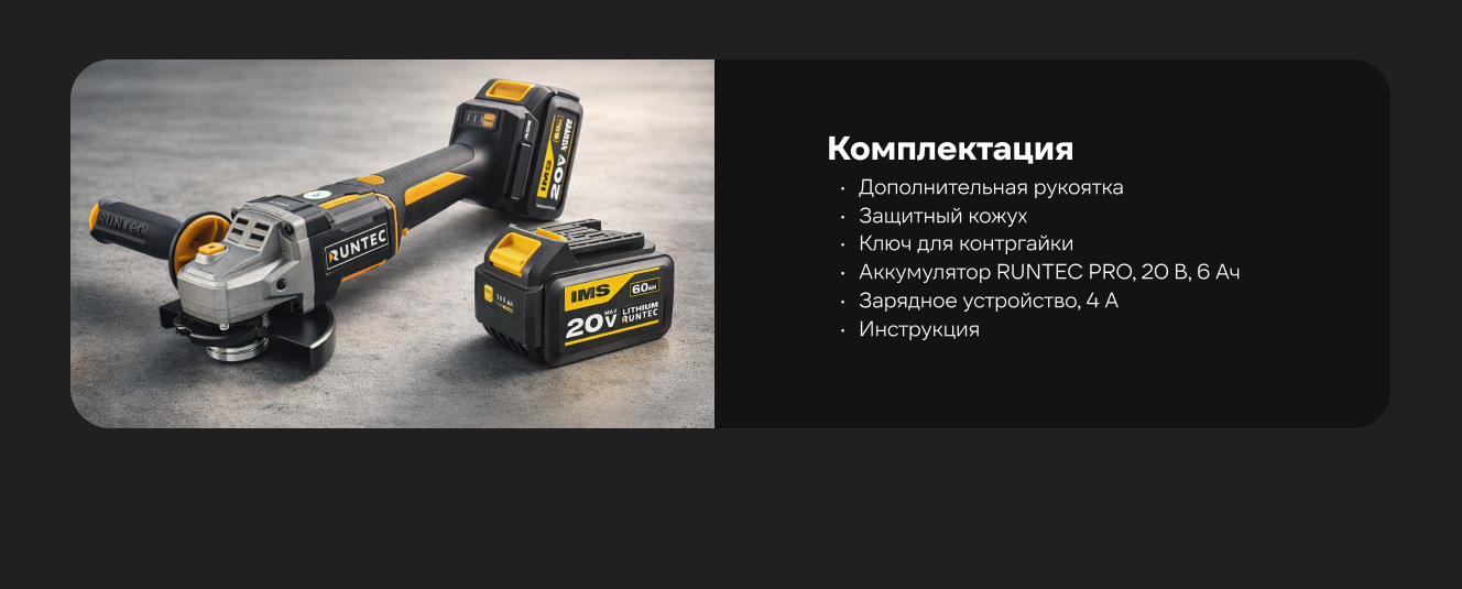 Шлифмашина угловая Runtec аккумуляторная PRO 125 мм, 20В, 2х6Ач, 1600Вт RT-AG1600