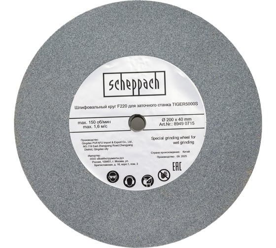 Диаметр 200 мм и посадочное отверстие 12 мм соответствуют параметрам заточного станка Scheppach TIGER5000S, обеспечивая правильную установку, балансировку и безопасную работу.