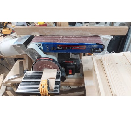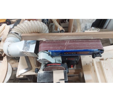 За такие деньги не плохой станочек. Немного доработал аспирацию, на ленте, под шланг 100мм, потому как подключать пылесос ну как то уж слишком много шума от него. На круге сделал переходник на шланг 60мм, т.к. им реже пользуюсь. Приладил упор чтобы можно было кромку под прямым углом шлифовать. Мощности двигателя вполне хватает. Скорость ленты не слишком быстрая, что порадовало, т.к. шлифую сосну и не быстрой скорости пыль прикипает.