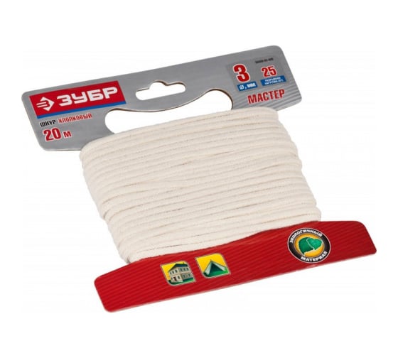 Шнур хлопковый Зубр плетеный, натуральный, без сердечника, диаметр 4 мм, 20 м 50350-04-020 применяется в строительстве, для рукоделия и хозяйственно-бытовых целей.