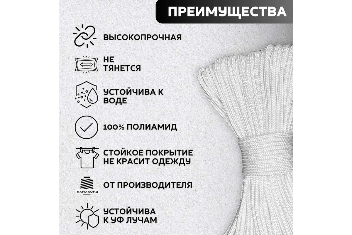 Используйте ее как веревку для тентов и палаток, бельевую веревку для бытовых нужд или для крепления якоря на лодке. Полиамидный материал делает шнур легким, устойчивым к влаге и ультрафиолету, что позволяет использовать его в любых уличных условиях.