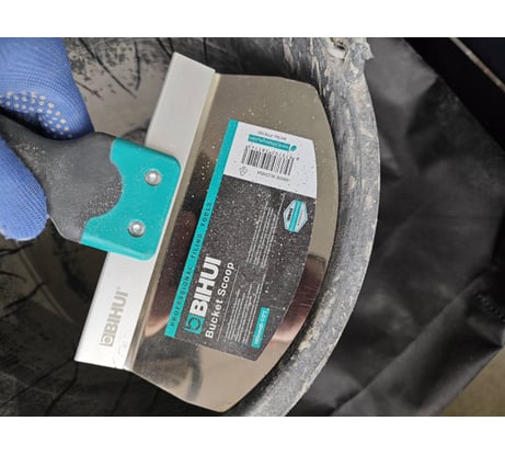 Шикарный прочный шпатель, некоторым не нравится не полное соответствие дуги диаметру ведра, но это значит две руки левые, поиграл дугой шпателя в право-в лево,можно и шпатель полностью загрузить и стенку ведра очистить. Им и намет делается почти как ковшом, легче чем прямым гораздо . Ручка удобная.