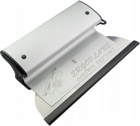Шпатель алюминиевый из системы PROFESSIONAL SYSTEM ERGOPLANE для механизированного нанесения, в комплекте сменное лезвие с острыми углами из закалённой нержавеющей хромированной стали, толщина полотна 0.5мм имеет деликатную фаску по краю лезвия полотна, что даёт идеальный результат при заглаживания материала на финишных покрытиях. Поставляется с двумя по краям специальными заглушками для стабильного удерживания лезвия в профиле.