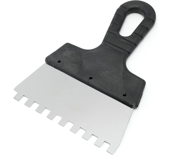 Шпатель из нержавеющей стали - незаменимый инструмент для профессиональных строителей и любителей самостоятельных ремонтных работ. Он предназначен для выполнения широкого спектра задач при строительстве, ремонте и отделке. Зубчатый шпатель предназначен для равномерного нанесения жидкого клеевого состава на горизонтальную поверхность, для распределения тонкого слоя клея по подготовленной площади для приклеивания облицовочных или отделочных материалов. У шпателя полотно изготовлено из нержавеющей стали, а рукоятка из ударопрочного пластика, что обеспечивает его прочность и долговечность. Также он имеет квадратный зуб 8х8 мм.