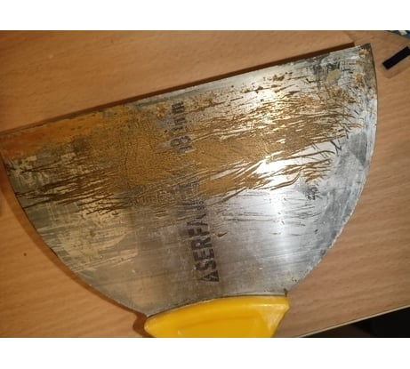 Не обратил внимание, что шпатель изготовлен не из нержавейки. Вопрос, к чему такая экономия? У меня все, самые дешевые шпатели из нержавейки, даже как-то подумать не мог, что бывает иначе.