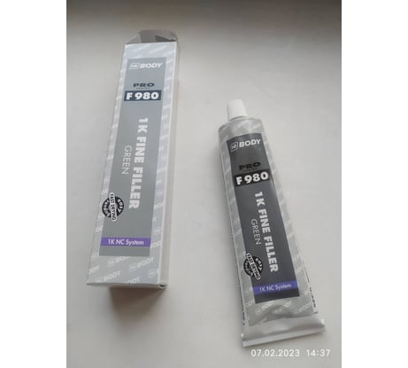 На картинке показан синий тюбик с маркировкой P980, в жизни серый с надписью F980. На коробке ни одного русского слова. На тюбике есть русский. И указано, что это ГРУНТ-НАПОЛНИТЕЛЬ. Большие буквы потому, что там именно большими написано. Судя по всему это альтернативное наименование шпатлëвки. Написано GREEN. Я уж думал, что у меня с различием цветов напряг, но жена тоже определила цвет шпаклëвки серым.