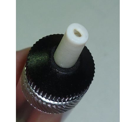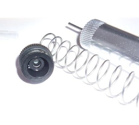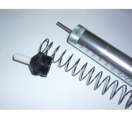 - в корпусе мусор (крупная алюминиевая и пластиковая стружка): разбираем в ноль, моем, продуваем, протираем и сушим; - пружина из толстой проволоки, но слишком жёсткая и с двумя лишними витками; - очень шумный (щелчок при взводе и сильный хлопок при нажатии на кнопку); - фторопластовый носик изначально был частично закрыт (вряд ли это конструктивное решение); - при полном нажатии кнопки взвода, штырь не выходит полностью из носика – придётся ещё срезать 2-3 мм фторопласта.