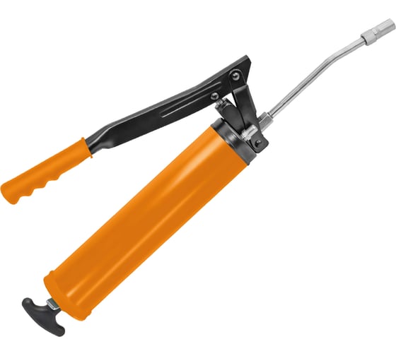 Шприц выполнен из прочного металла, имеет компактные размеры и простую конструкцию. В комплект входят гибкий шланг длиной 300 мм, жёсткая трубка 150 мм и сопло, что делает его универсальным для работы в разных условиях. Благодаря рычажному механизму обеспечивается равномерная подача смазки, а работа возможна одной рукой.