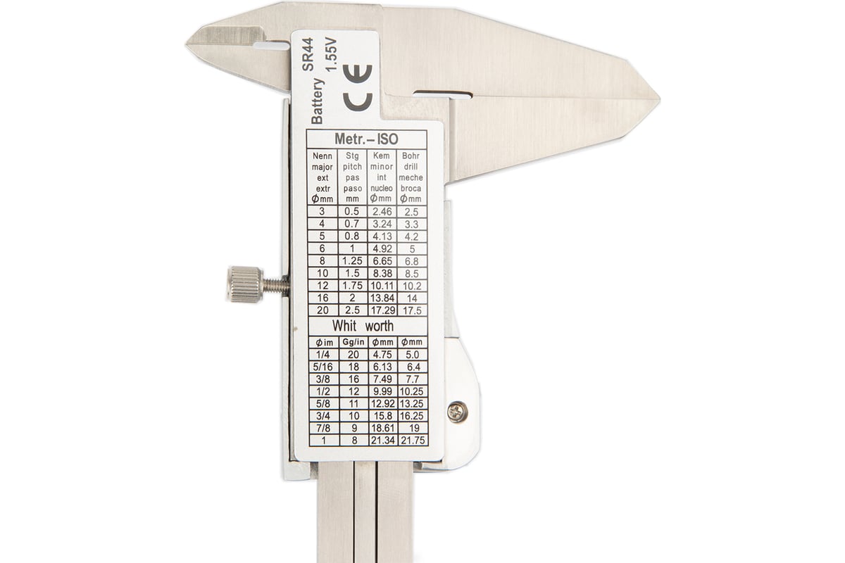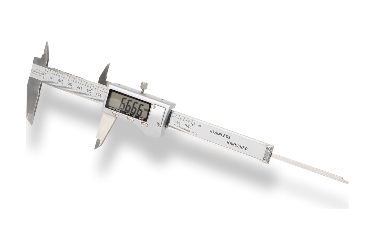 Штангенциркуль оснащен цифровым отсчетным устройством с кнопками управления: кнопки включения/выключения (ON/OFF), установки нуля (ZERO) и выбора единиц измерений мм/дюйм (mm/inch). Шаг дискретности отсчетного устройства составляет 0,01 мм.