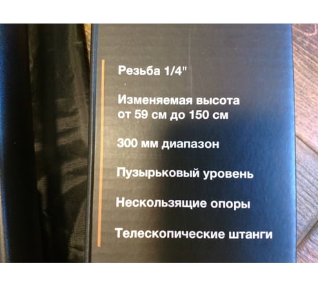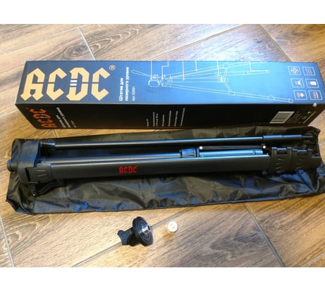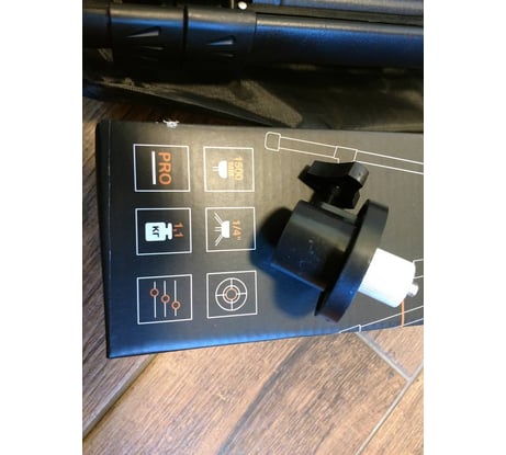 Упакован в отдельный мешочек из плащёвки, а значит не будет пылиться. Есть дополнительный алюминиевый переходник. Возможность легко при необходимости увеличить высоту при помощи "треноги" выдвижением каждой из "ног". Крепёж и ручка подъёма центрального стержня пластиковые. Центральный шток пока что ходит с усилием и поднимается/ увеличивает высоту ещё на тридцать сантиметров.