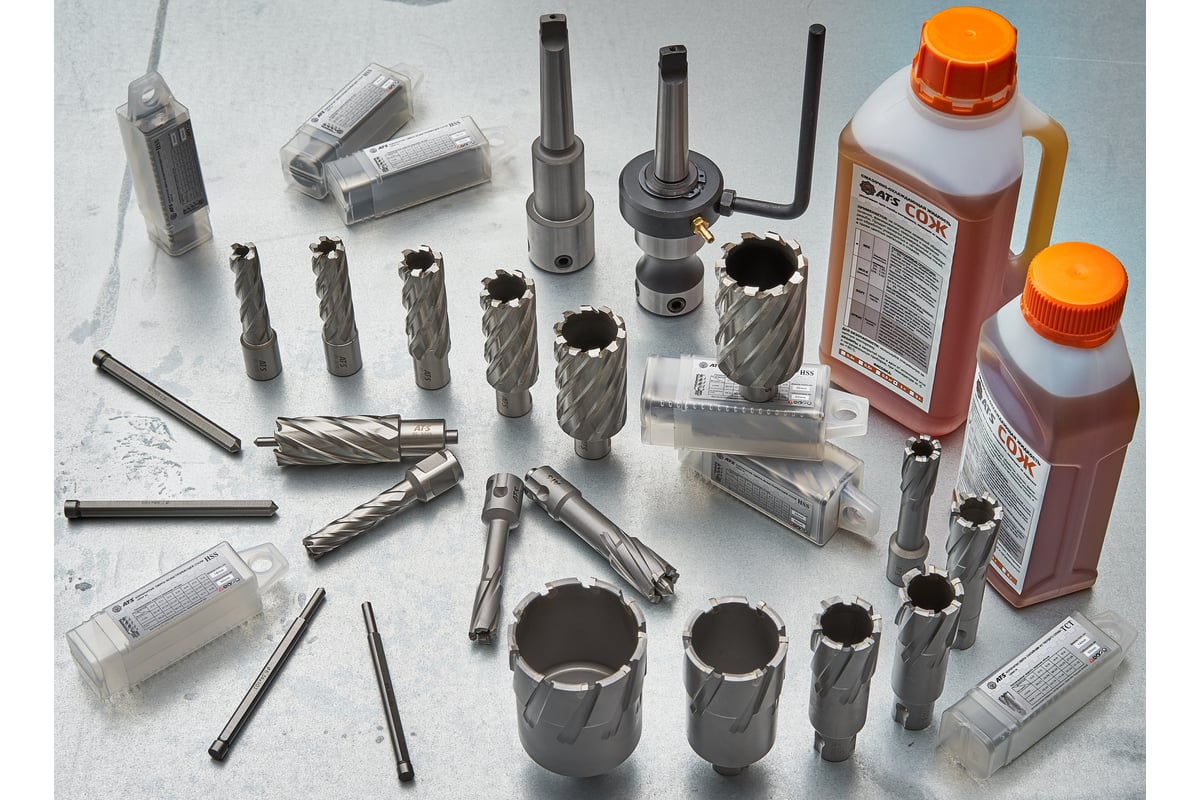 Штифт-выталкиватель AT-S 7.98x180 мм необходимо использовать совместно с корончатыми сверлами (фрезами). Вставляется штифт в середину фрезы и имеет две функции: первая – так как середина фрезы полая, то с помощью направляющей можно легко отцентрировать будущее отверстие, вторая - как только начинается процесс сверления, клапан утапливается внутрь фрезы и через специальные пазы изнутри на рабочую часть начинает поступать СОЖ.