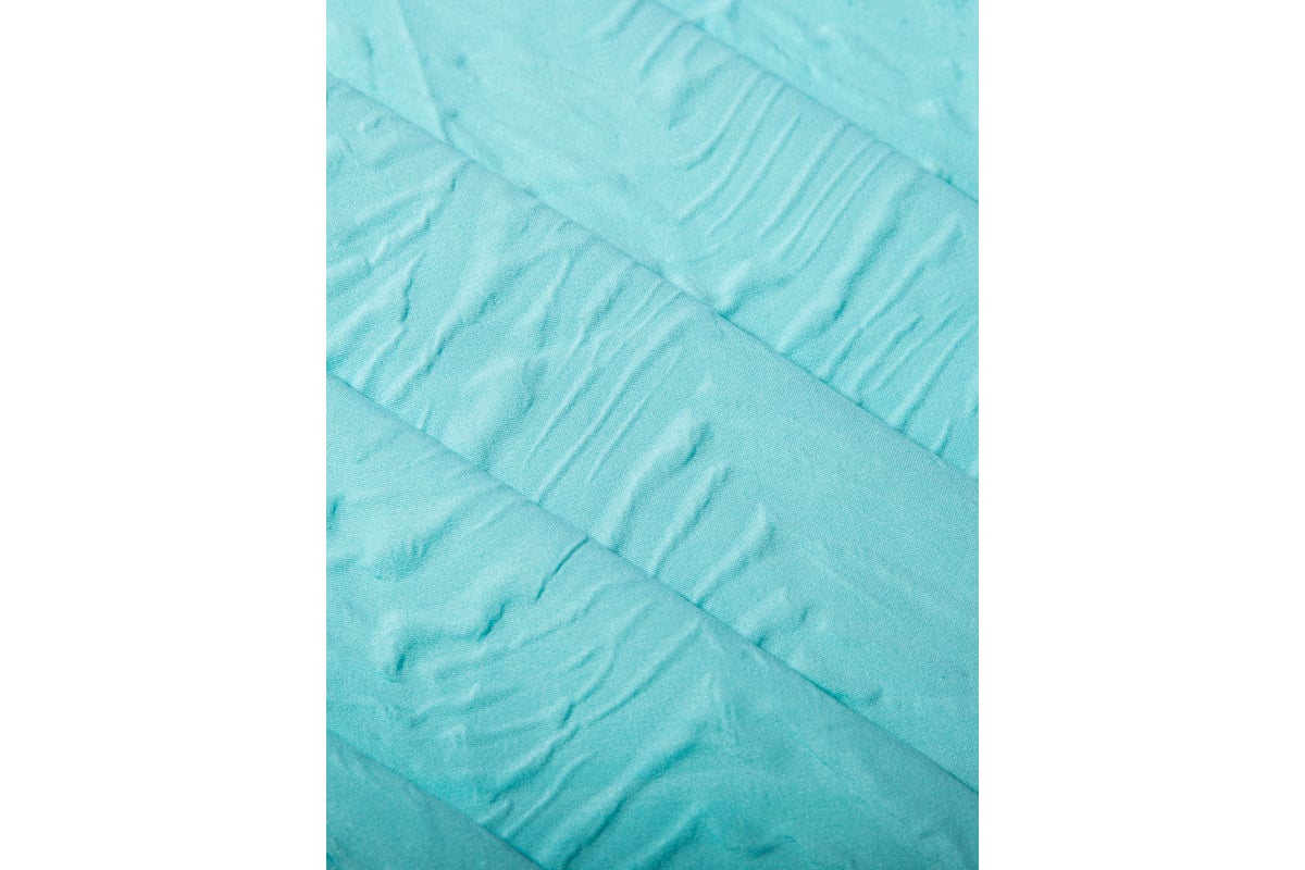 Бирюзовый цвет, в котором выполнен аксессуар, придает ванной свежесть и нотку морской глубины, что создает ощущение спокойствия и умиротворения. Объемная фактура ткани, имитирующая лен, имеет интересные элементы текстуры и является важным дополнением к дизайну шторы.