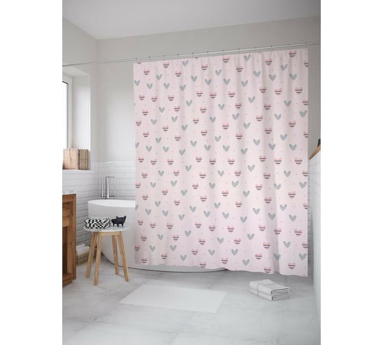 Штора для ванной JOYARTY "Сердце в полоску" из сатена, 180x200 см с крючками sc_422625