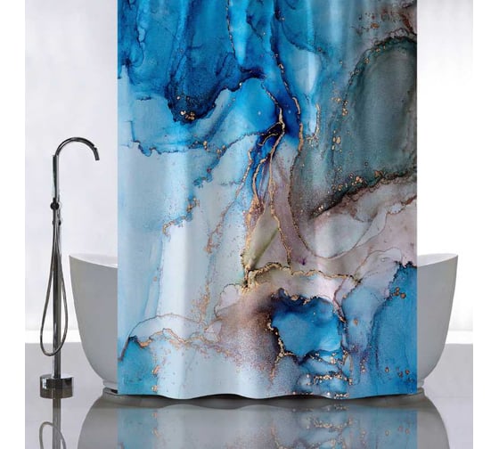 Штора Санакс с рисунком голубой мрамор с золотом, в ванную комнату, без колец, полиэстэр, 180х180 см 01-114