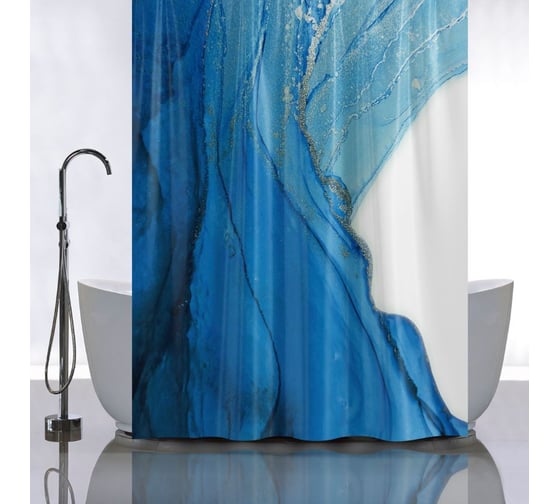 Штора САНАКС с рисунком синий мрамор с серебром, в ванную комнату, без колец - полиэстэр, 180 х 180 см. 01-115