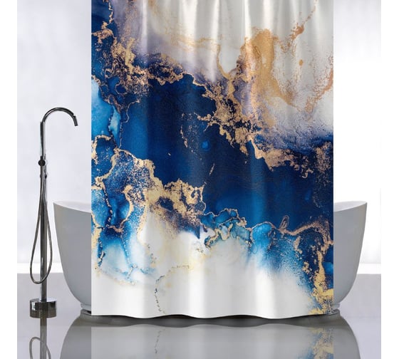 Штора САНАКС с рисунком синий мрамор с золотом, в ванную комнату, без колец - полиэстэр, 180 х 180 см. 01-113