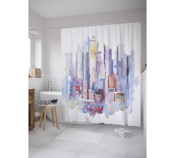 Штора (занавеска) для ванной JoyArty "Акварельный мегаполис" из сатена, 180х200 см с крючками, sc_27681