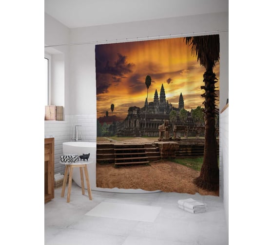 Штора (занавеска) для ванной JoyArty "Ангкор Камбоджа" из сатена, 180х200 см с крючками, sc_14114