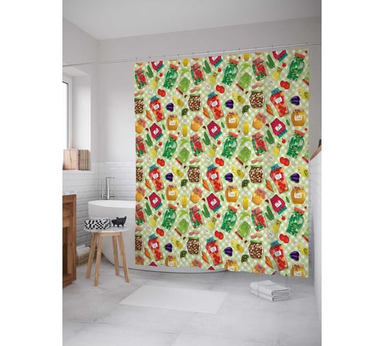 Штора (занавеска) для ванной JoyArty "Банки со счастьем" из сатена, 180х200 см с крючками, sc_32024