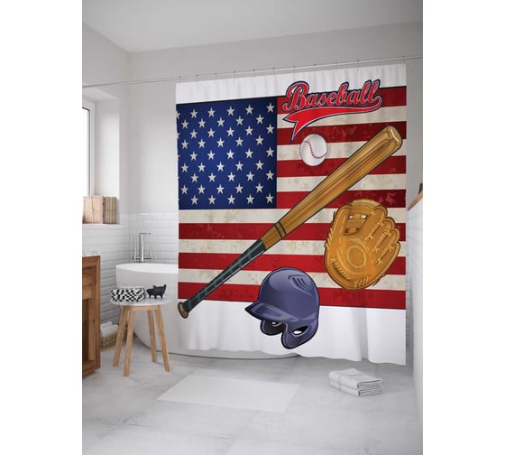 Штора (занавеска) для ванной JoyArty "Бейсбольная Америка" из сатена, 180х200 см с крючками, sc_11453