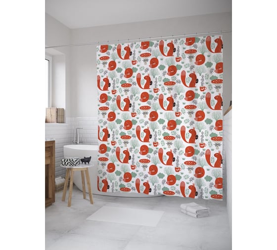 Штора (занавеска) для ванной JoyArty "Белка и лиса" из сатена, 180х200 см с крючками, sc_61426