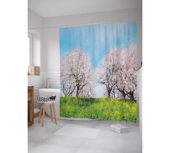 Штора (занавеска) для ванной JoyArty "Белоснежное цветение" из сатена, 180х200 см с крючками, sc_17423