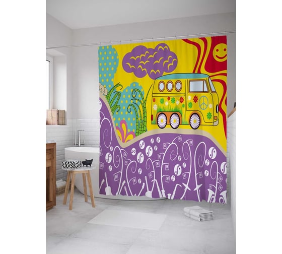 Штора (занавеска) для ванной JoyArty "Беззаботный мир" из сатена, 180х200 см с крючками, sc_78604