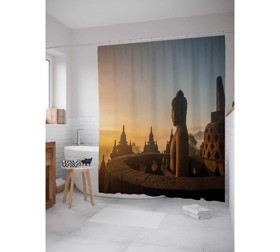 Штора (занавеска) для ванной JoyArty "Будда наблюдает рассвет" из сатена, 180х200 см с крючками, sc_14102