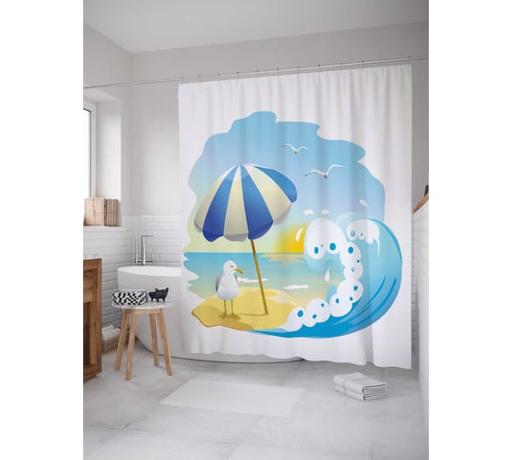 Штора (занавеска) для ванной JoyArty "Чайка у волны" из сатена, 180х200 см с крючками, sc_17514
