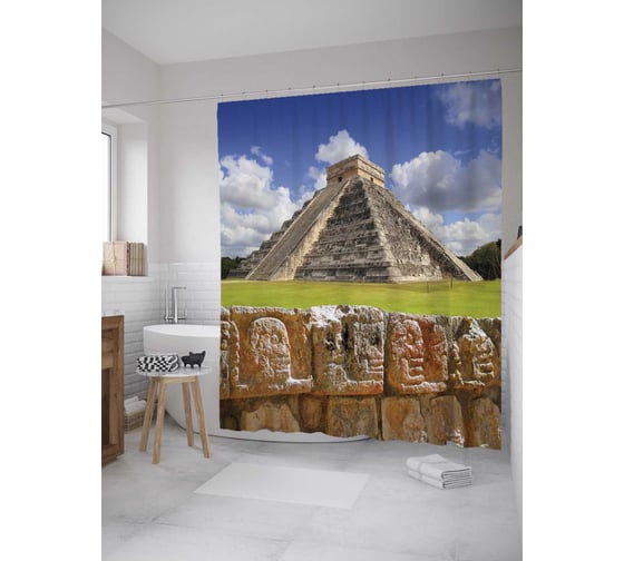 Штора (занавеска) для ванной JoyArty "Чичен-Ица" из сатена, 180х200 см с крючками, sc_27931