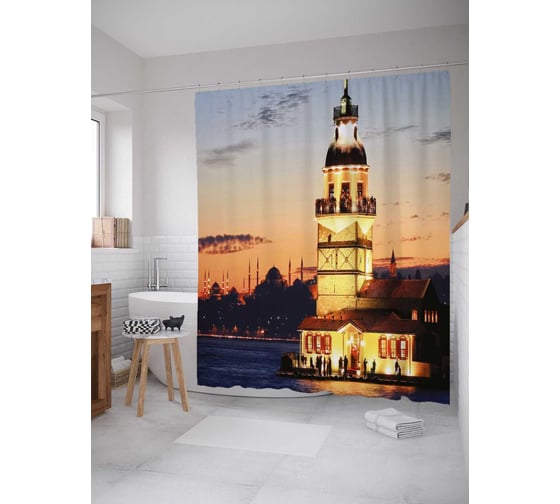 Штора (занавеска) для ванной JoyArty "Делегация у маяка" из сатена, 180х200 см с крючками, sc_1372